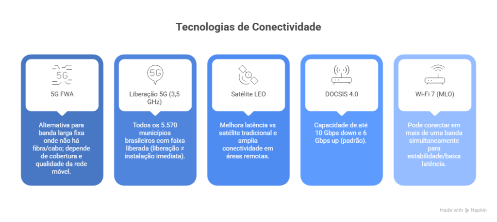 Nesse cenário, a tendência não é “matar” a fibra — é ampliar o cardápio. A internet além da fibra ótica virou realidade porque surgiram tecnologias que conseguem entregar boa experiência sem depender de passar cabo na sua rua, no seu prédio ou na sua fazenda.